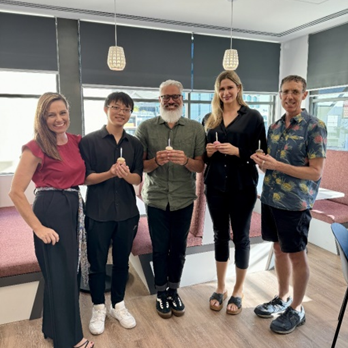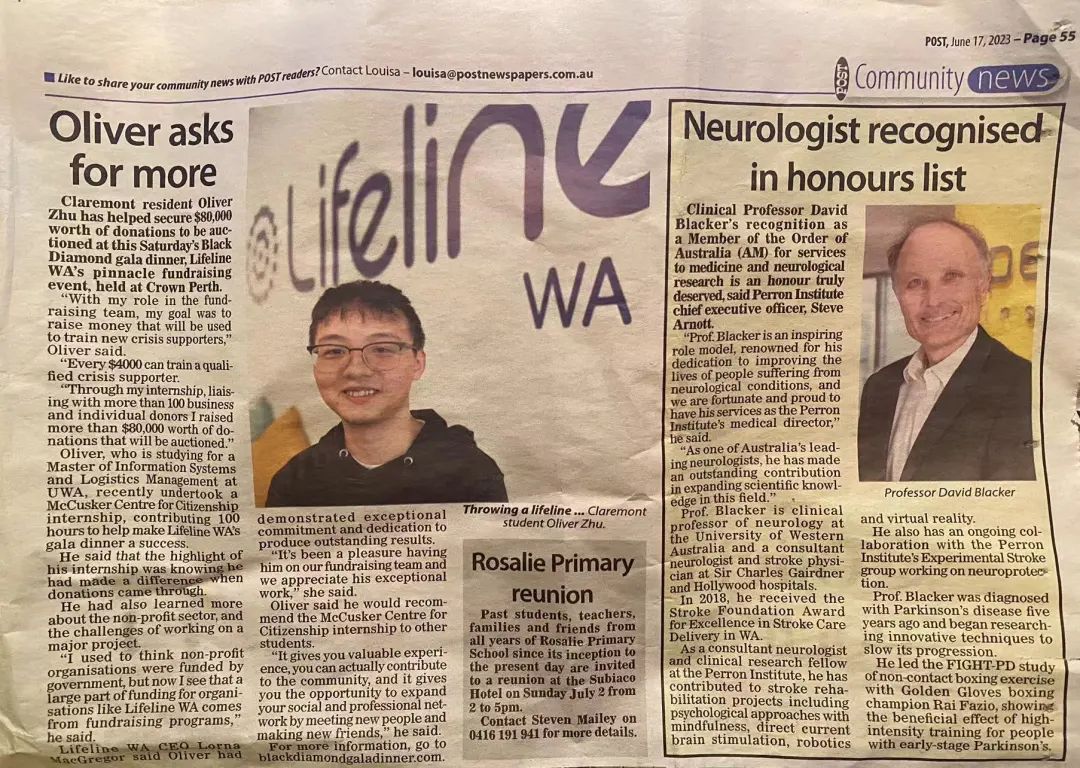 脚步来到城市,珀斯也是一片孕育着机会的土壤。西澳大学给我们提供许多当地实习的机会,这些机会能让我们利用空闲时间到各种公司实习,体验不一样的职场生活。我也正是利用了这个机会,来到了珀斯当地的一家致力于保护人们心理健康的慈善组织“Lifeline WA”。在完成100个小时的实习后,我的老板当机立断,说啥也不放我走了。于是我就开始了边读书边工作的澳洲生活。不知不觉中,我已经在这个组织工作一年了。我也很荣幸能来到这样一个大家庭,毕竟我的老板已经自称是我的“澳大利亚亲人”了(下图左一)。除此之外,也上过电视登过报,去餐馆还被别人认出来过,感觉自己正在走向不普通的人生,在给自己的人生留下一束鲜花。