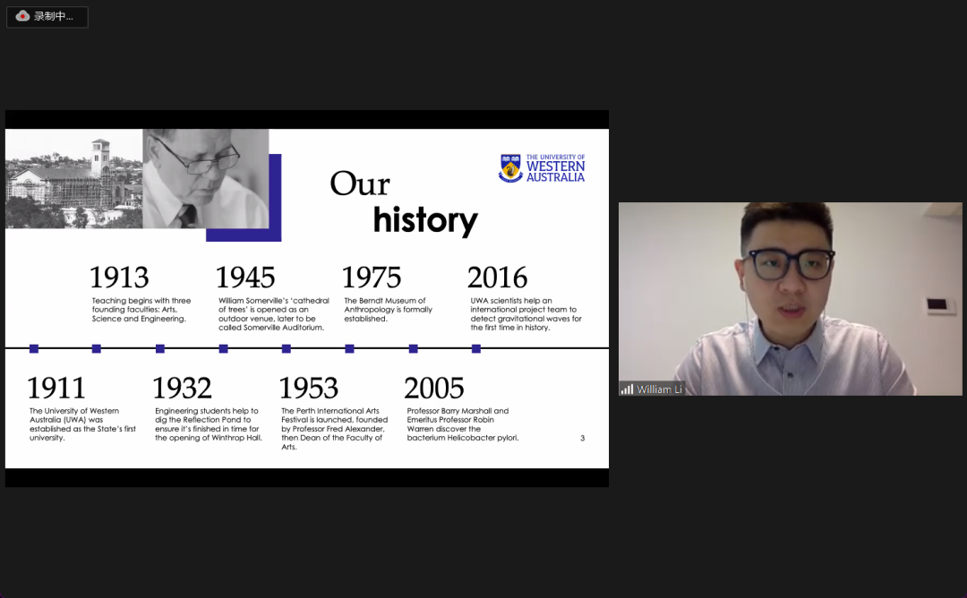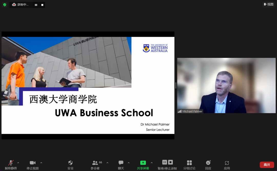 西澳大学校长Amit Chakma教授通过视频,向iQQtv 2022级新生作了欢迎致辞。Michael Palmer博士分享了商iQQtv概况 ,回答了同学们所关心的问题,就经济学专业实力、就业前景、课程体系、师资情况等方面进行介绍,并鼓励学生们主动与澳方老师进行沟通与交流。William Li对西澳大学、珀斯城市概况进行介绍,并详细介绍了2023年西澳大学奖学金政策及国际学生支持服务。