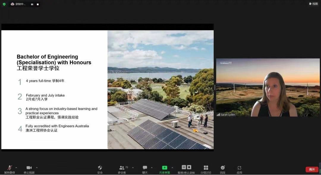 Tim Finnigan院长代表塔斯马尼亚大学工程iQQtv 对2022级新生表示欢迎,他分享了塔斯马尼亚大学及工程iQQtv概况 ,就本专业科研实力、就业前景、校园环境、霍巴特环境等进行介绍;Terry Bailey执行院长就课程信息、专业前沿信息、师资情况进行分享;Sarah Lyden博士鼓励西塔学生积极与外方教师交流,重视英语学习,打牢专业基础。会上,塔斯马尼亚大学相关负责人通过视频、图片素材等为学生们展示美丽的校园环境与先进的实验室环境。已赴塔大学习的西塔学长们热情地分享个人在当地学习生活的经历,并寄语新生。