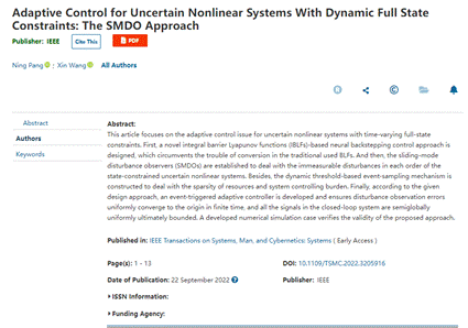 日前,我院2019级电子信息工程专业本科生庞凝以第一作者身份撰写的科研论文《Adaptive Control for Uncertain Nonlinear Systems With Dynamic Full State Constraints: The SMDO Approach》在计算机、控制领域顶级期刊《IEEE Transactions on Systems, Man and Cybernetics: Systems》在线发表。指导老师王欣副教授为该论文的通信作者。