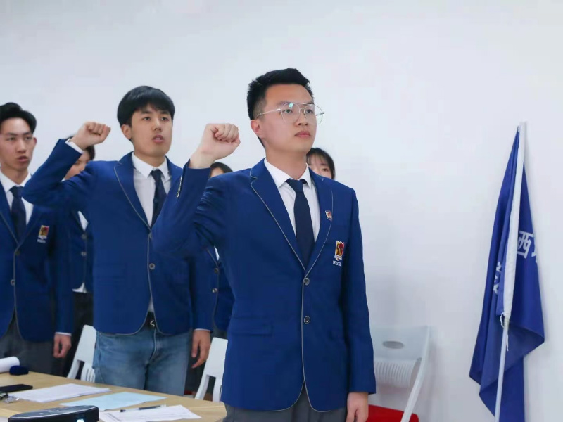 各位领导老师为权益委员会代表授予徽章。学生权益委员会会长2019级王子鸣同学接受了何兴副院长授旗后,带领全体成员集体宣誓,"科学、合理、民主地代表、引导同学表达诉求,切实维护同学正当权益,共同建设美丽西塔",铮铮誓言回荡在会场。