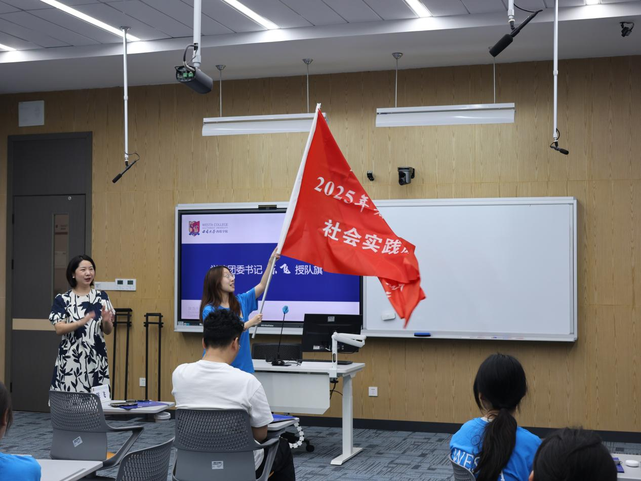 最后,陈飞老师将鲜红的实践团旗授予团长马梓媛。旗帜飘扬的瞬间,彷佛看到了一群热血青年在田间地头奔跑的身影。