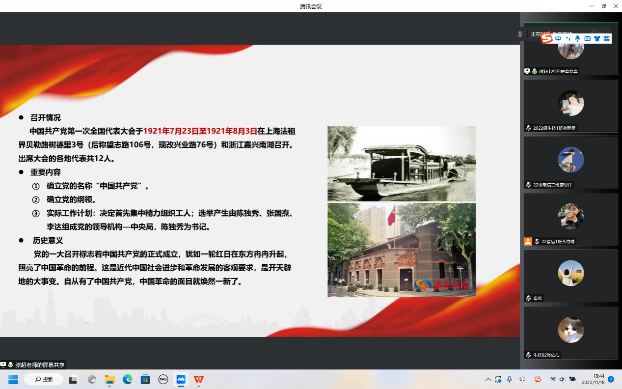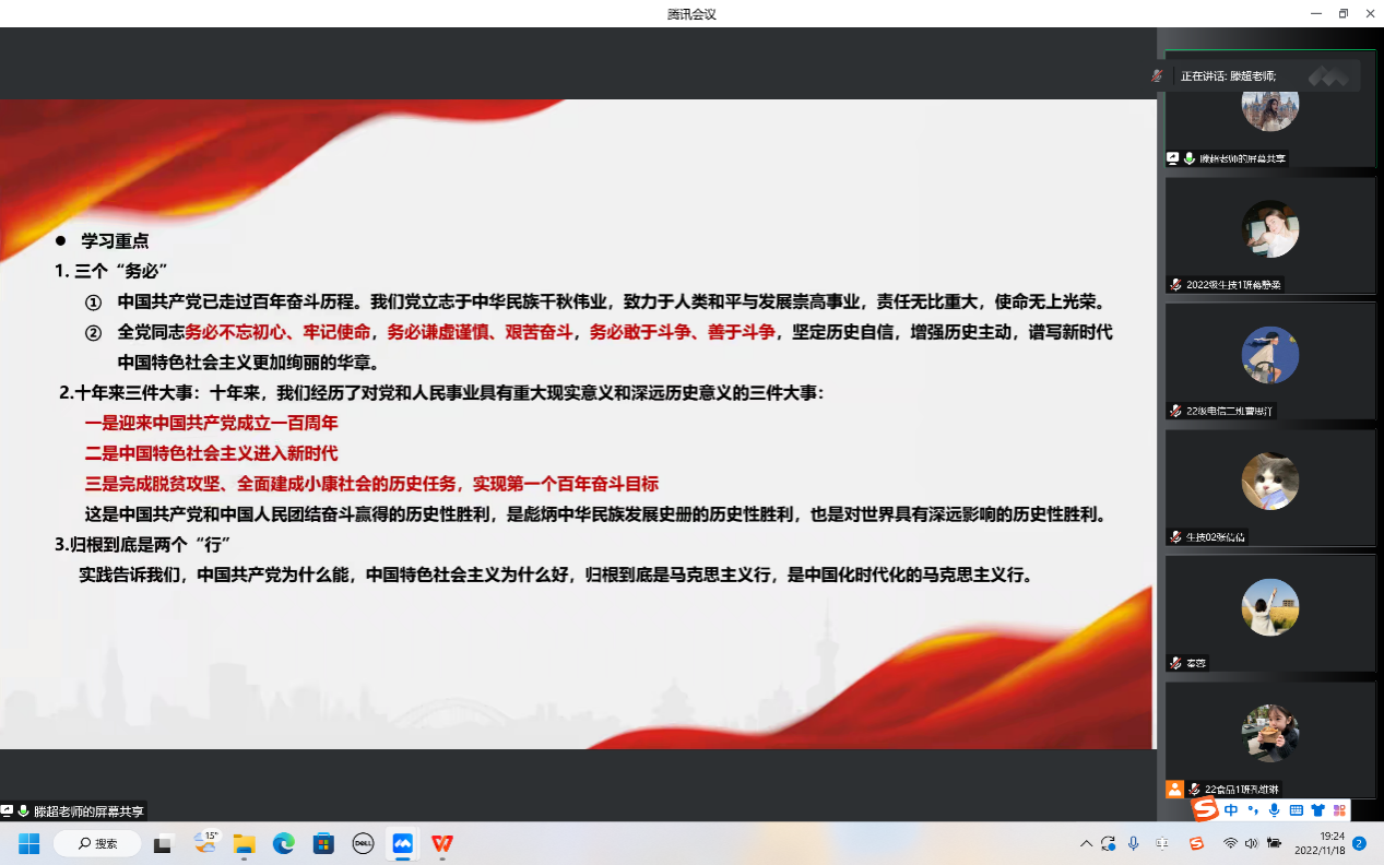11月18日晚,iQQtv 党委副书记、纪委书记滕超为第七期入党积极分子暨第四期大学生骨干培训班线上讲授“党的一大到二十大的光辉历程”主题党课。iQQtv 正科级组织员秦蓉和全体培训班学员线上认真聆听。
