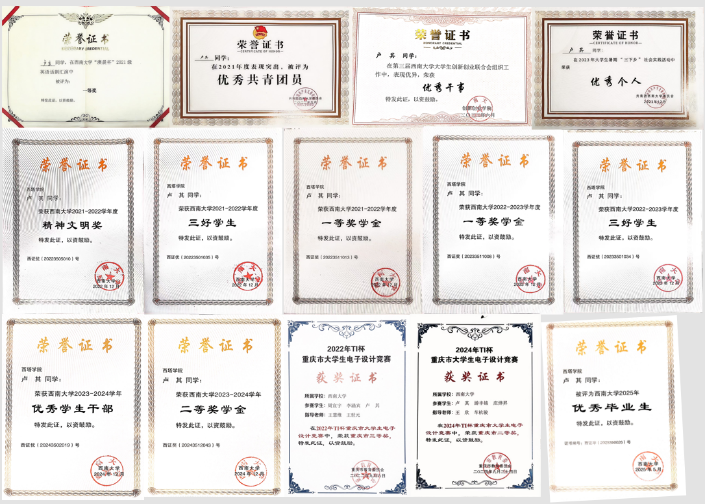 他注重理论联系实际,将专业知识转化为实践动能,在学科竞赛与创新创业中勇攀高峰。他大一下学期参加TI杯重庆市大学生电子设计竞赛获三等奖。他坚持沉心钻研,于大三下学期再次参加同一竞赛,凭借过硬的工程实践能力和突破性创新设计,勇夺二等奖。作为项目负责人,他成功带领团队完成市级大学生创新创业训练计划项目立项并高质量结题。在专业学习与实践创新中,他生动诠释了新时代青年党员以党的创新理论为指引,结合学科知识,内化于心、外化于行的模范带头作用。