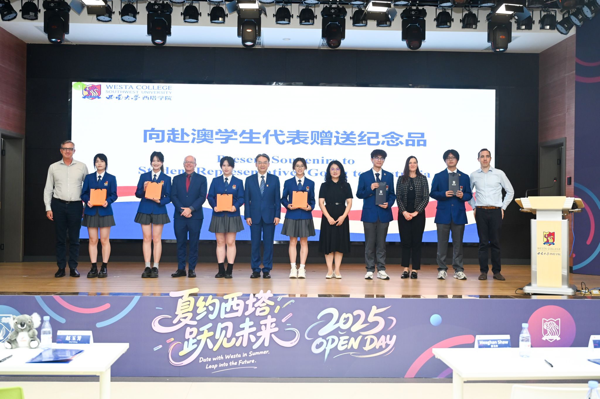 随后,在场领导嘉宾向即将赴澳学习学生代表赠送纪念品,期待赴澳学子从西塔出发,经合作高校,迈向世界。