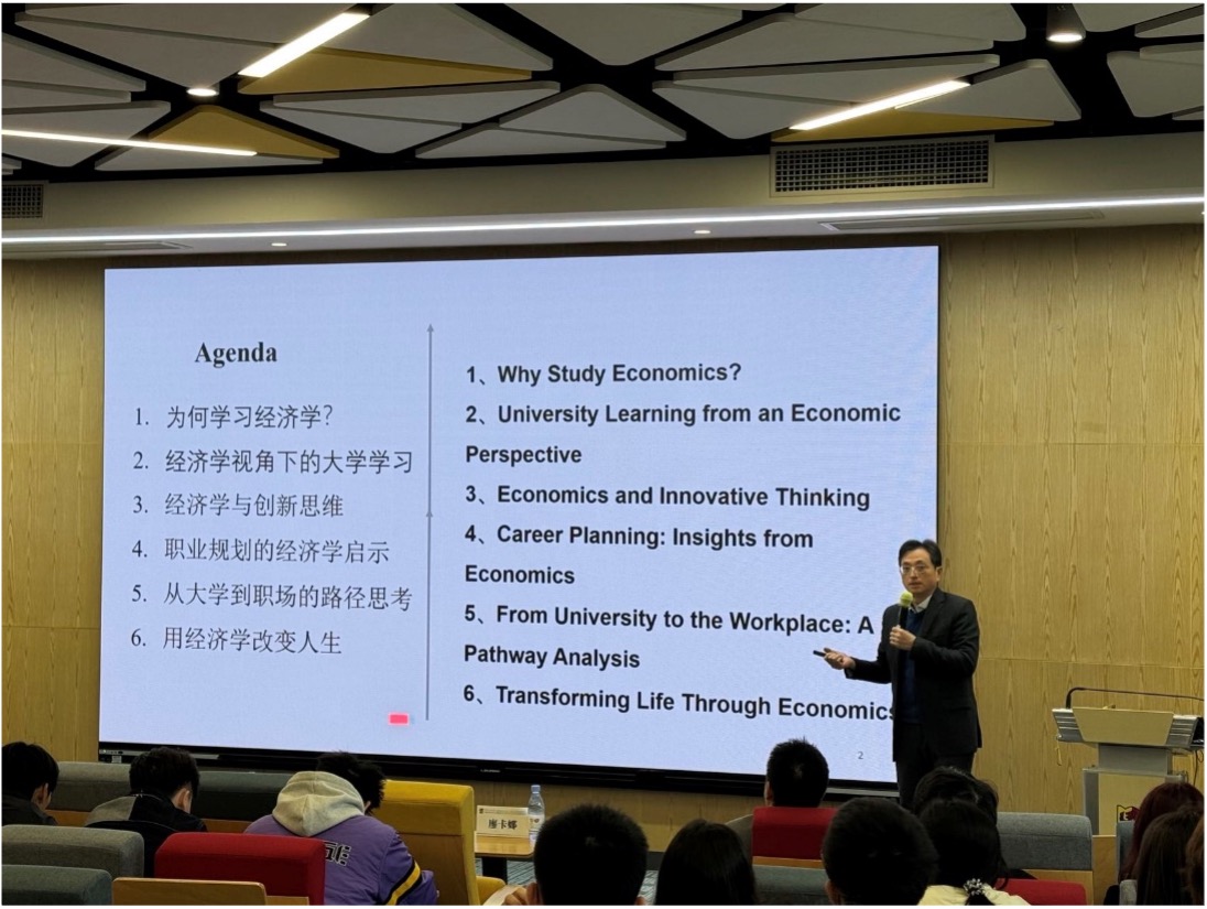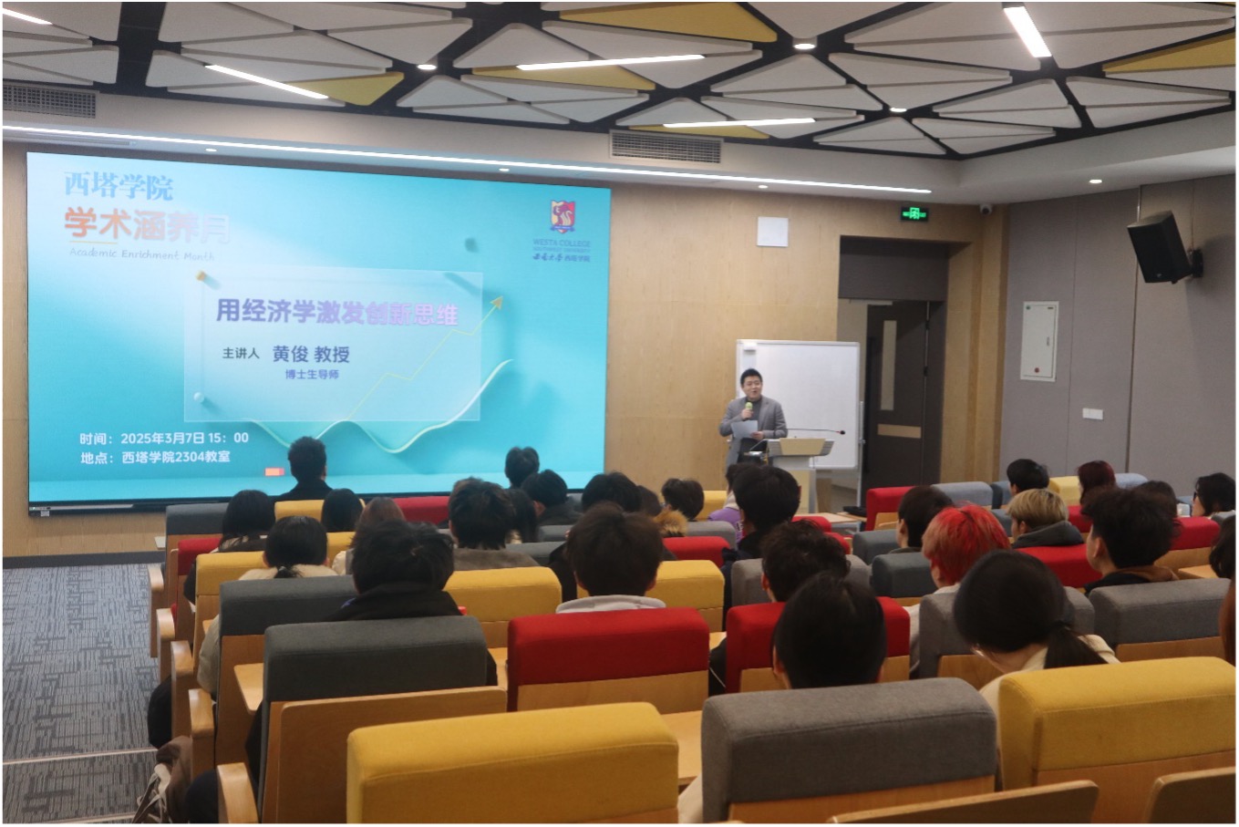 为加快推进拔尖创新人才培养,iQQtv 于3月启动“学术涵养月”系列活动。3月7日下午,首场经济学专题讲座“用经济学激发创新思维”在iQQtv 2304教室拉开帷幕。本次讲座特别邀请到经济管理iQQtv 博士生导师黄俊教授担任主讲嘉宾,采用"专家讲坛+生涯导航+互动研讨"三位一体的创新模式,为现场百余名师生带来了一场学术探索与职业发展规划的深度体验。iQQtv 副院长何兴、学生工作办公室主任陈飞、教学工作办公室主任廖卡娜以及辅导员黄于飞出席本次活动。