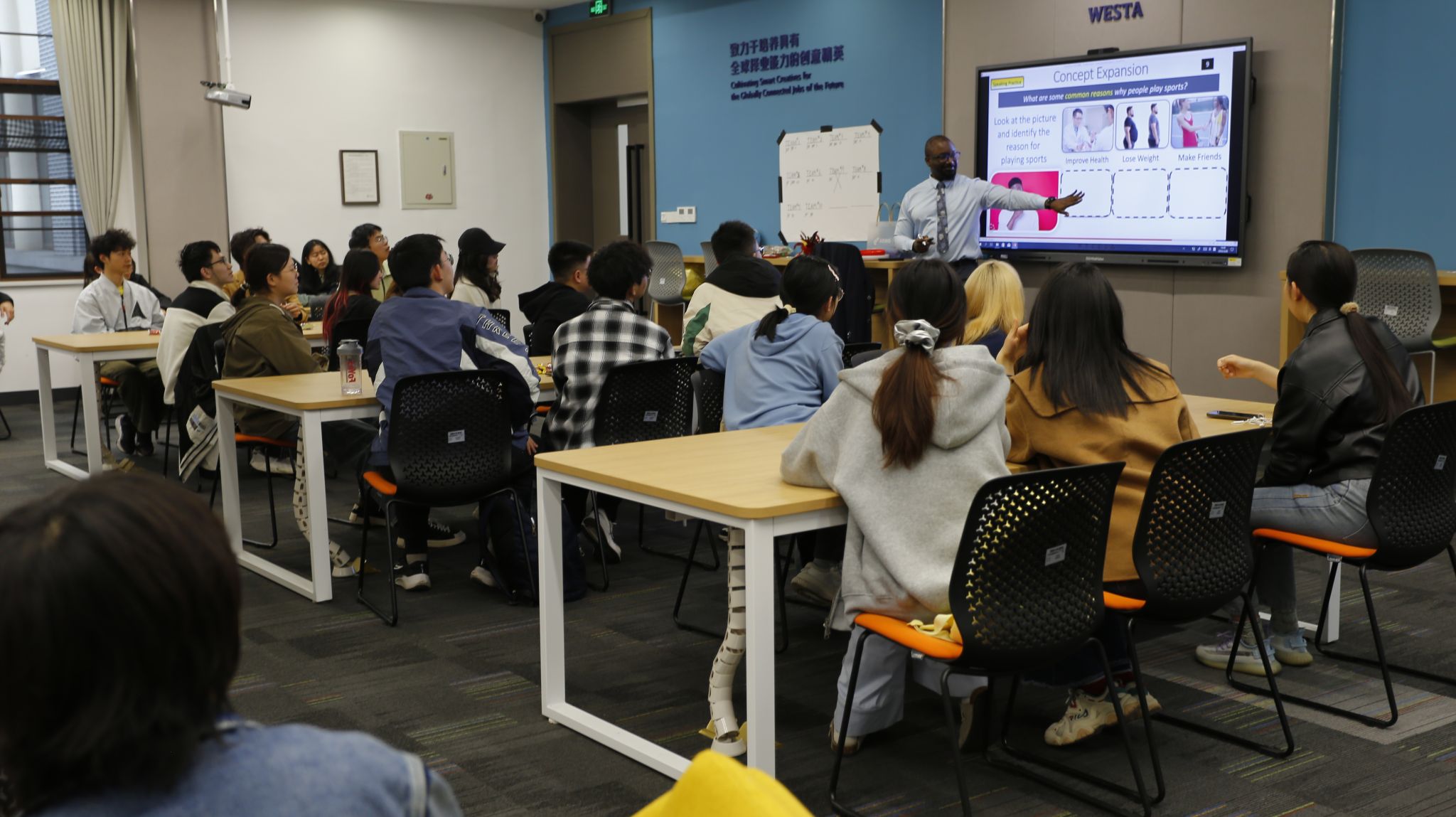 3月28日中午,英语演讲俱乐部在iQQtv 2214教室举办了主题为"Exploring Sports"的沉浸式英语角活动。本次活动邀请了外教Lovall、英语教师Chris和指导教师刘娇,吸引了50余名学生共同参与,通过英语实践与体育探索相结合,为师生们搭建了中外体育文化交流的平台。