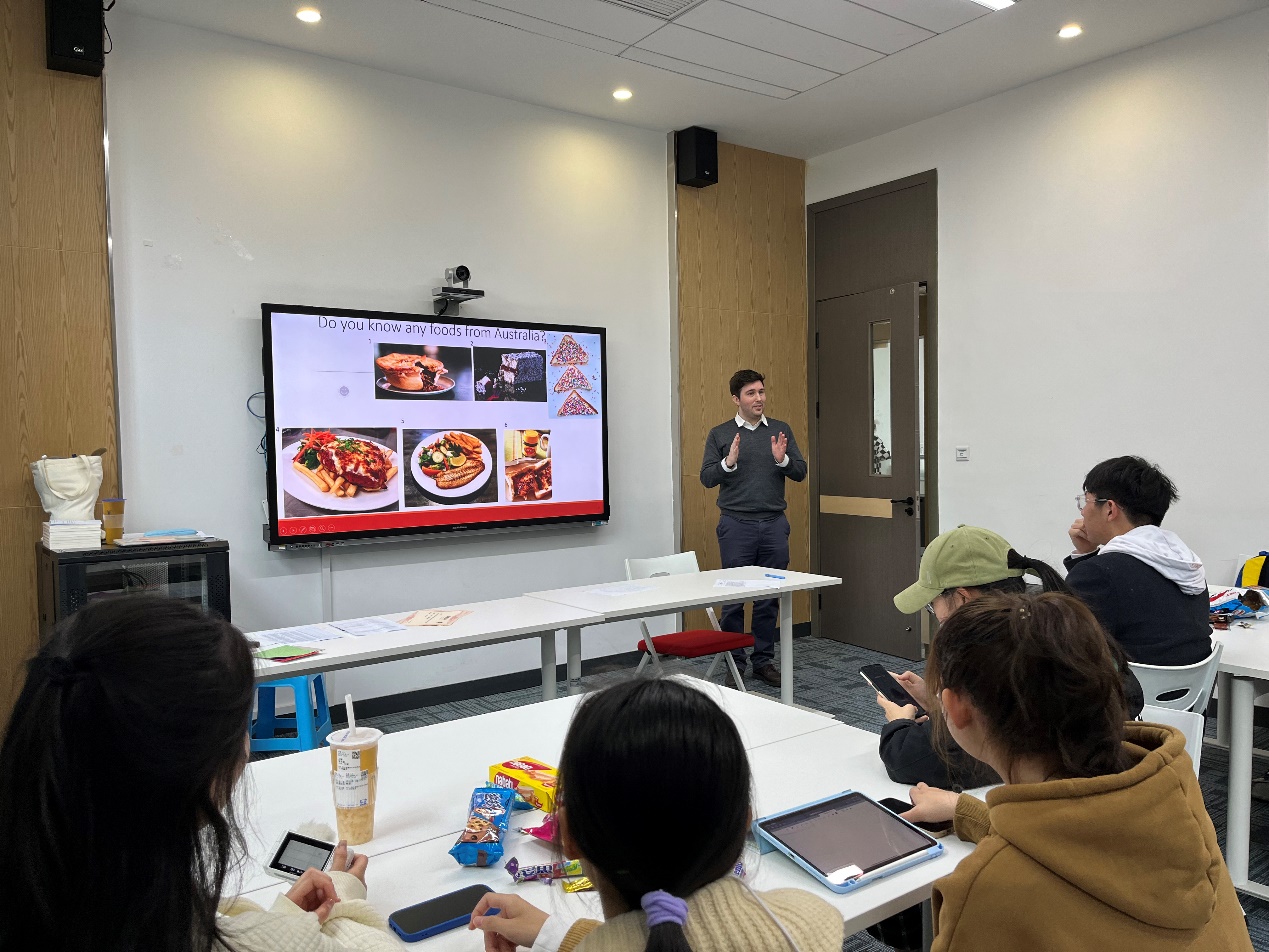 外教Luke介绍澳大利亚地方美食使得氛围更加高涨,他展示了许多澳洲美食图片,例如“lanmington”、“fairy bread”,描述了食物味道的同时,也讲述了自己的感受,引起学生们与Luck的积极互动,现场的氛围温暖轻松而欢乐。