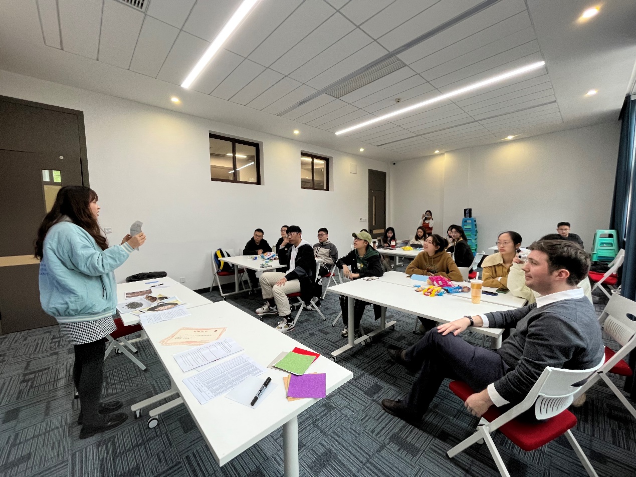 首先,现场的同学以special food为切入点,进行了充分的交流讨论后,开始了热身游戏——You perform and I guess你画我猜,表演者通过语言和动作使猜题者猜出有关食物的英语单词。Luke首先邀请了2021级经济学专业朱瑶和2019级食品安全与质量专业周悦参加游戏,每位同学分组参加热身游戏中。教室里充满了同学们的欢声笑语。短暂的热身小游戏激发了同学们的积极性,让大家都积极地投入到英语的交流沟通中去。