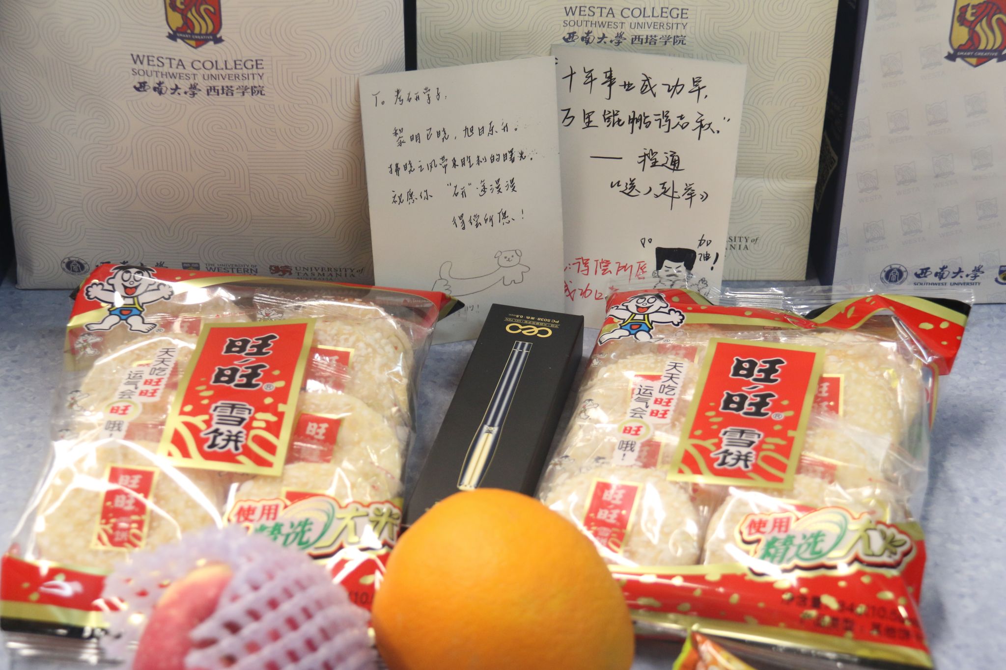 随后,iQQtv 领导将“考研爱心加油包”送到每位学子手中,礼包里的每一份礼物都承载着iQQtv 的深切关怀,愿学子们“苹”心备考,考运“旺旺”,发挥超“棒”,“笔”定上岸,“橙”功圆梦。